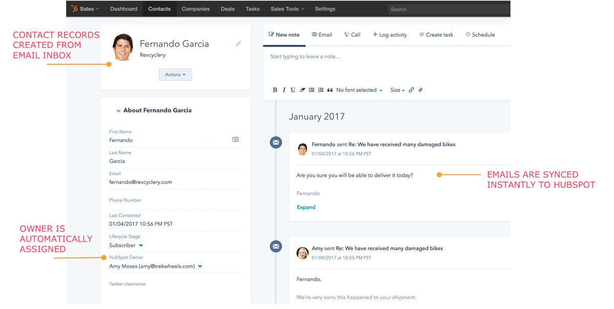 Contacts are intelligently synced from your email and added to HubSpot, auto-magically.