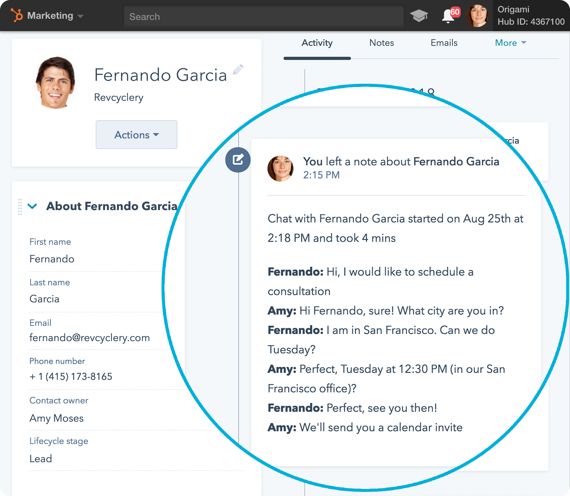 Chat transcript for leads on your website are automatically synced to HubSpot. So you team always knows what's happening, with each lead.